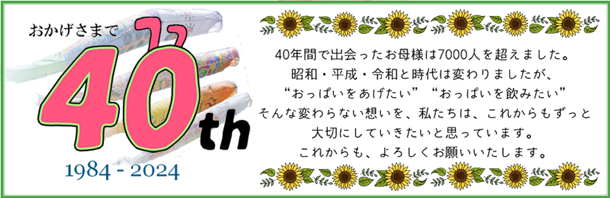 母乳育児相談を始めて42年になりました。7000人以上のお母様の育児のお手伝いをさせて頂きました。たくさんの皆様に助けられ歩んで来れました。感謝の気持ちでいっぱいです。